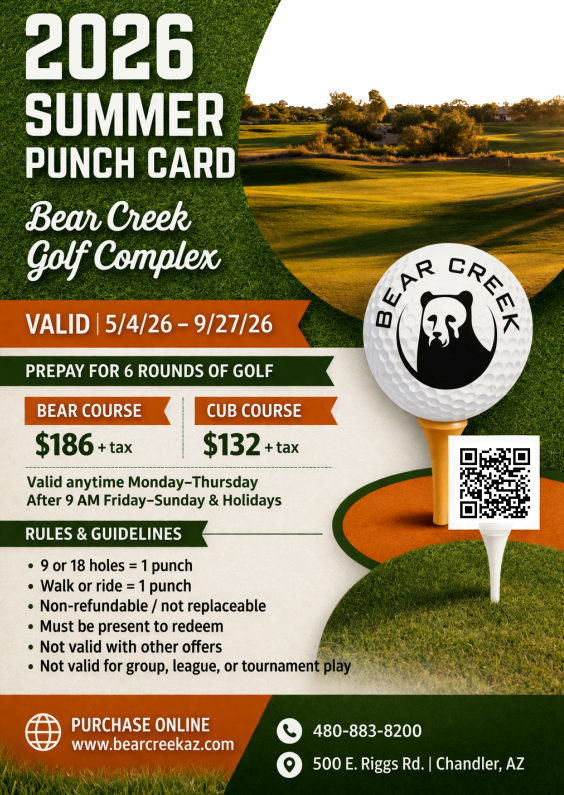 Bear Creek Golf Complex is a 36-hole “inland links” golf facility in Chandler, Arizona which consists of two courses: The 18-hole championship length “Bear” Course, and an 18-hole executive length “Cub” course.